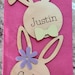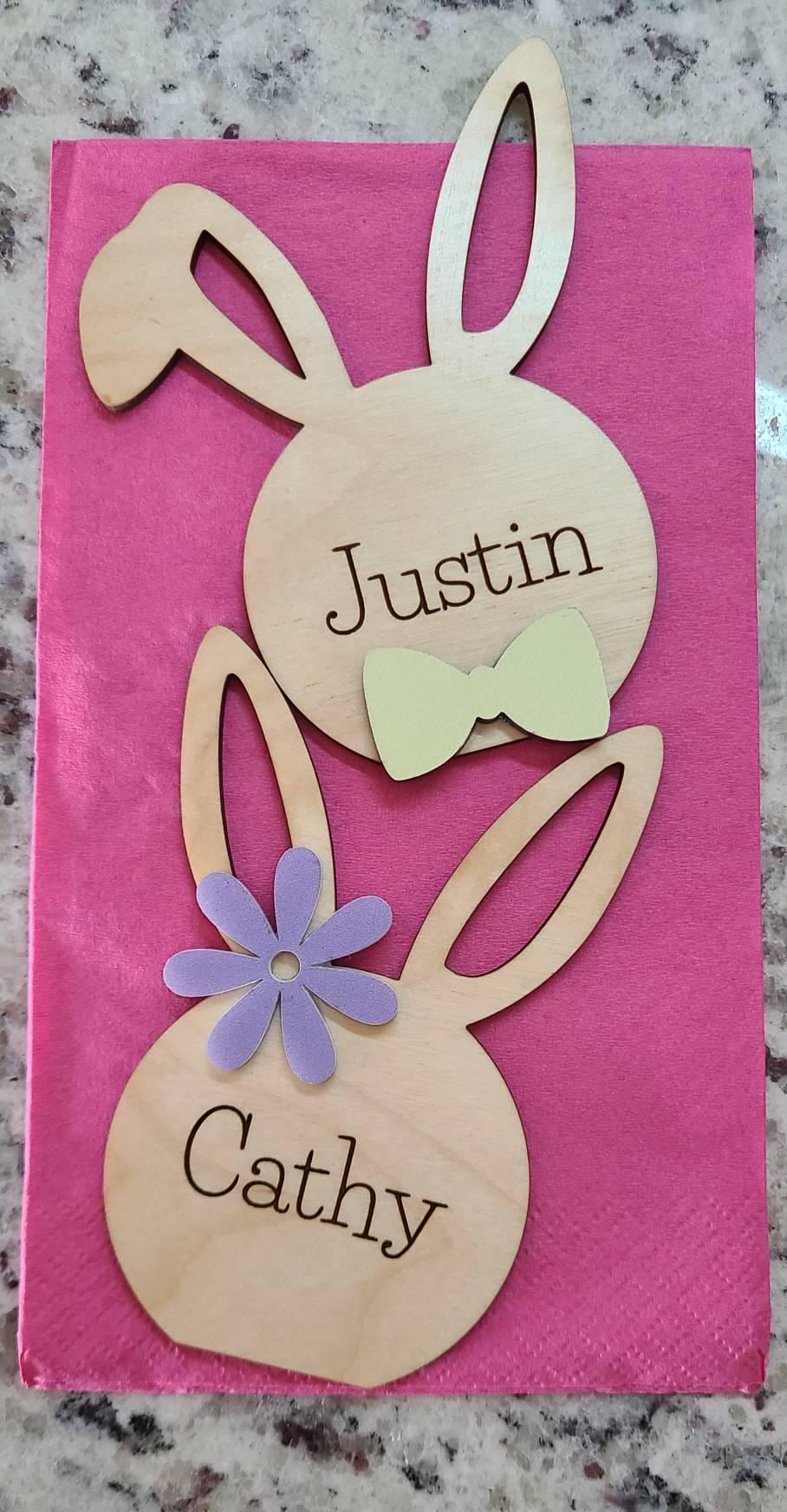Cute little bunny place cards for your Easter table. Fully customizable by choosing personalization, flower or bow and the colors! You can even pick a floppy ear bunny head or straight ear bunny head.